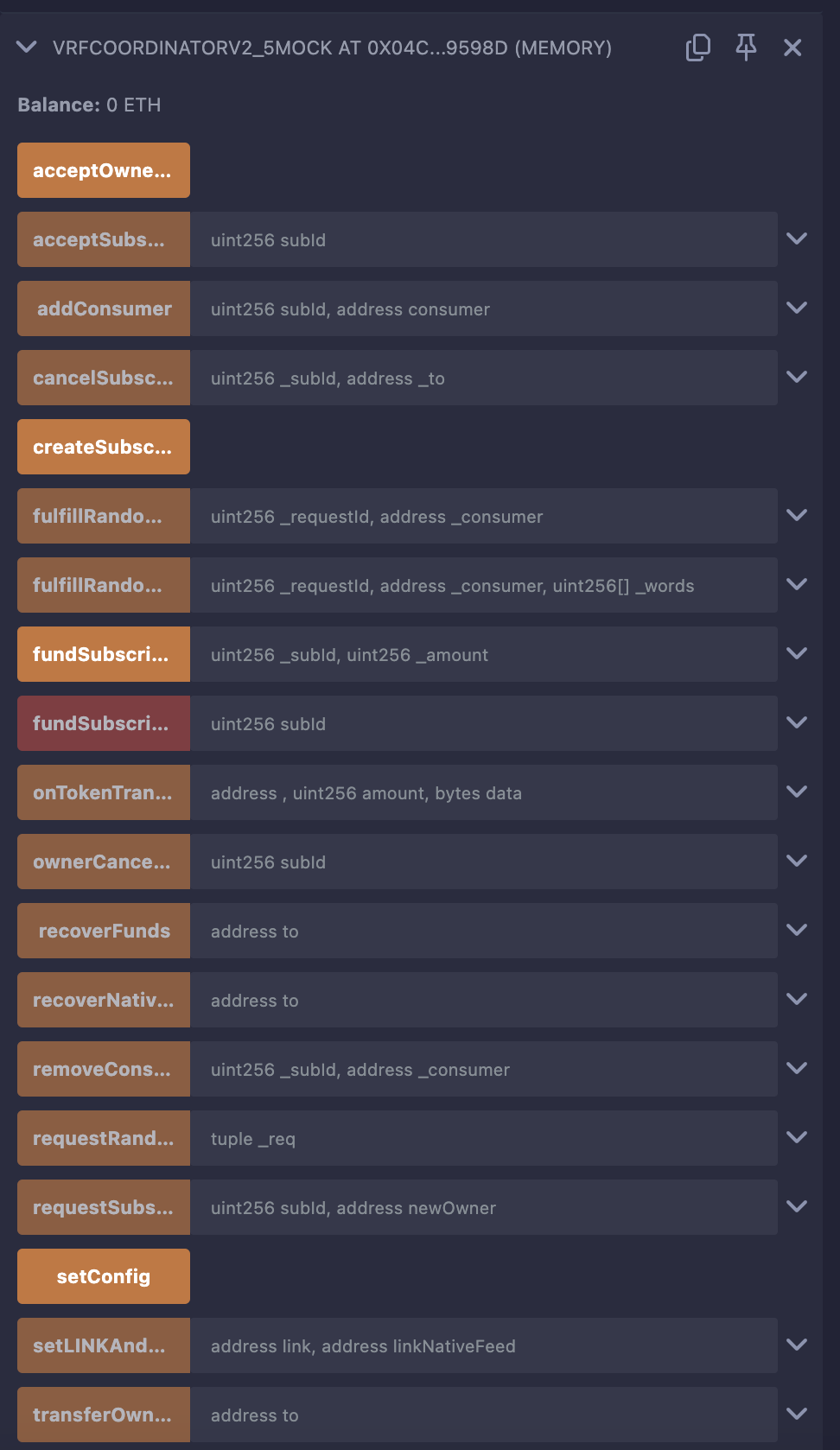 1. Under Deployed Contracts, open the functions list of your deployed VRFCoordinatorV2_5Mock contract.