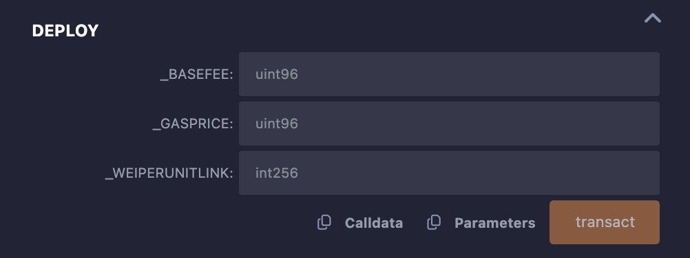 3. Under DEPLOY, fill in the _BASEFEE, _GASPRICELINK and _WEIPERUNITLINK. These variables are used in the VRFCoordinatorV2_5Mock contract to represent the base fee, the gas price (in LINK tokens), and the current LINK/ETH price for the VRF requests.